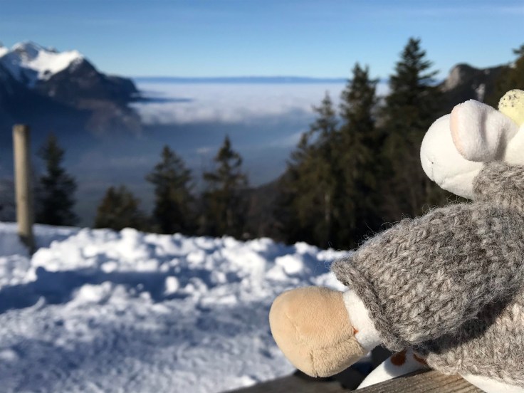 I am home. I can feel it in my body, which is relaxed and happy. I can feel it in the air, which is crisp and cool. I can feel it in the sun. I took Foro up to my “Frühstuckplatz” with me to look down at the fog that is covering the cities. He enjoyed the view!