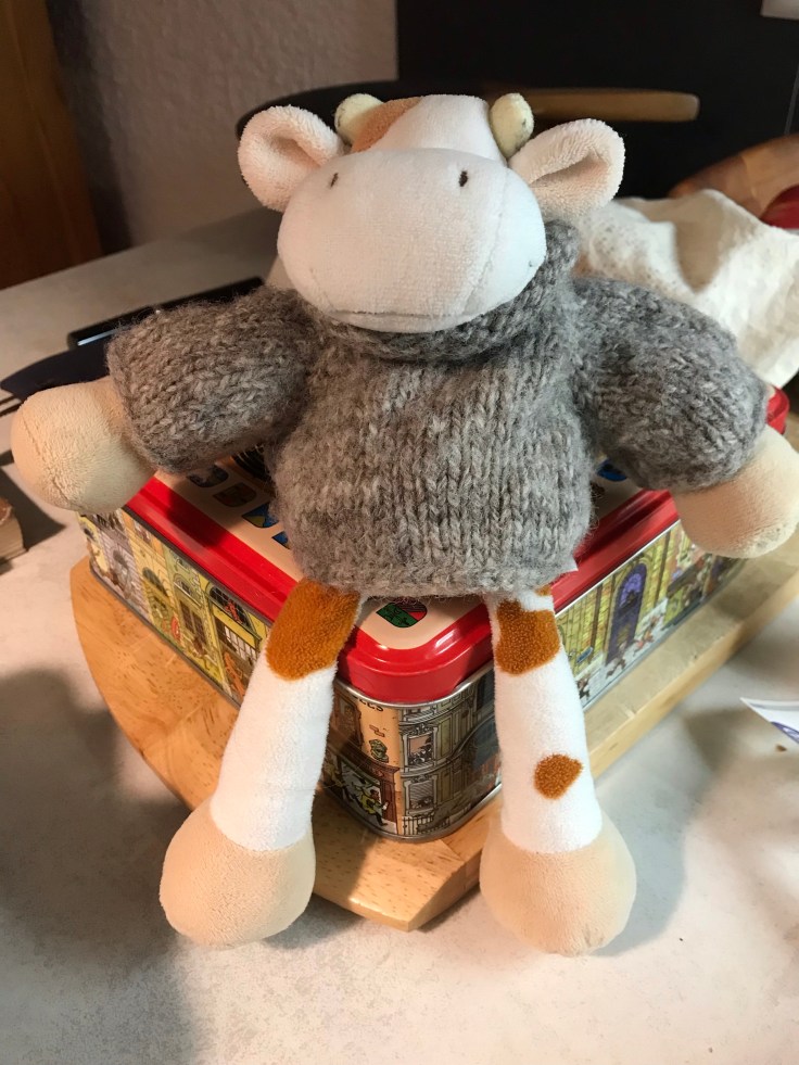 All this said, I’ve hesitated putting on Foro’s sweater for the year, but I think he needs it now. We’ve gotten our first snows in my village. A cow deserves his comforts…