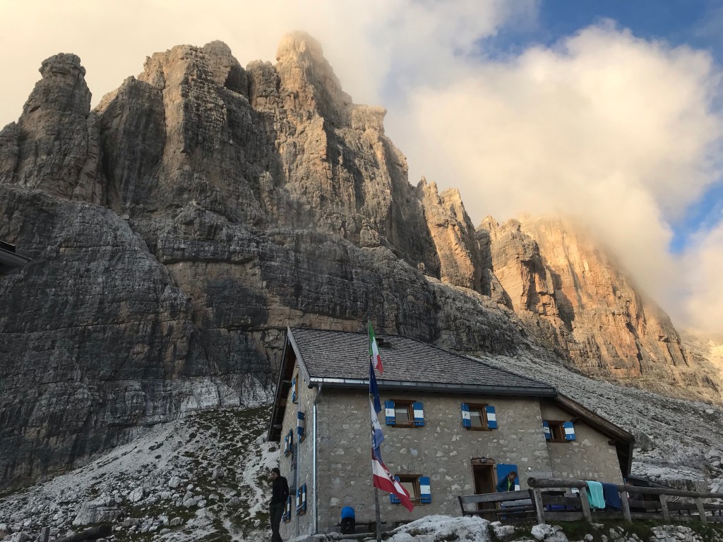 We’ve had two days of good enough weather to try out some climbs in the Brenta Dolomites. Yesterday we tried the Kiene route on the Castelleto Inferiore (the higher peak in the photo). I think we got a bit lost because the last two pitches were easier than the topo guide said. The beginning we got right though.