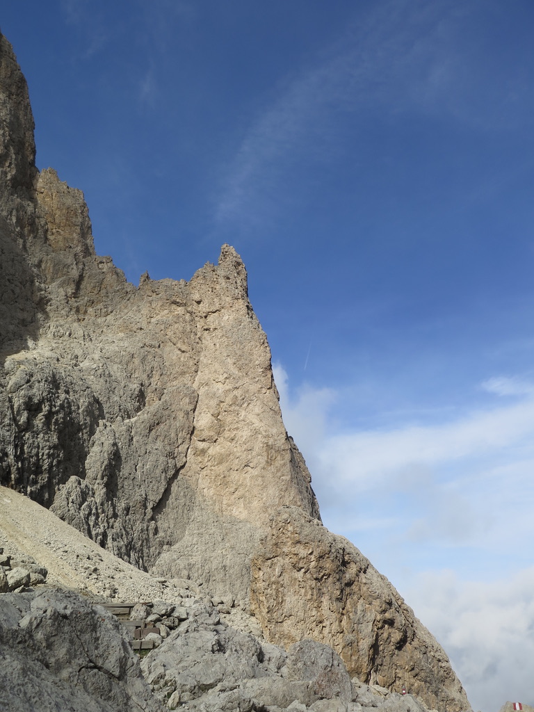 A little word about the Toni Demetz Hütte: the brother of Toni Demetz still helps out there with his wife. (Toni was apparently a young guide who died on Sassolungo in 1952, and the hut was named after him). They speak Italian, German and the local dialect of Ladin. The daughter is there, during our visit she was two weeks away from giving birth to a second child. I never got the name of Toni’s brother, but he is amazing. I’d guess he’s around eighty years old. I sent them a message just before turning off the phone, to ask if they had a description of the descent somewhere. He texted it to me, but it was only what we already had. I sent them a message when we were awake and moving in the morning, and he sent back a thumbs up. When we arrived, he had not been worried for us, but had looked at the weather report all the same. When I arrived at the hut, I gave the son-in-law a look and said, “I feel like I slept in my clothes” to which he laughed. Toni’s brother, the older man, was so very reasonable. We talked about the fact that it was uncomfortable but, like, hey, whatever. No one was going to die from spending a few hours in the cold on the side of a mountain; as long as we didn’t do something stupid, we were going to be just fine. The descent was so fractured, so difficult to see in the fading light that I was really pleased that we had stopped when we did, and where we did, because there were not a lot of places further along where we could have avoided the wind and been able to take off the harnesses and rest.