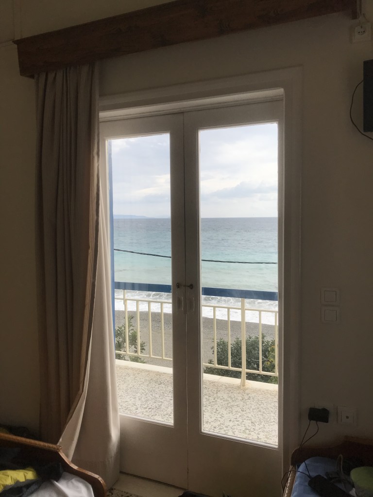 We’re still in Greece, and having to dodge the weather a bit in order to climb. We spent four days in Leonidio. We stayed in a hotel with the most beautiful view I’ve ever had in my life. That said, the room was tiny and run down. There was a shower base but no curtain or anything, so showering meant spraying water pretty much everywhere all over the bathroom (necessary to remove all towels and toilet paper before bathing, and doing it quickly before the hot water ran out). But at night, we could hear the waves, and if I woke up, I would just count the waves hitting the beach and after a few minutes, I’d be out again. We also swam every day, since the beach was just right there in front of us.