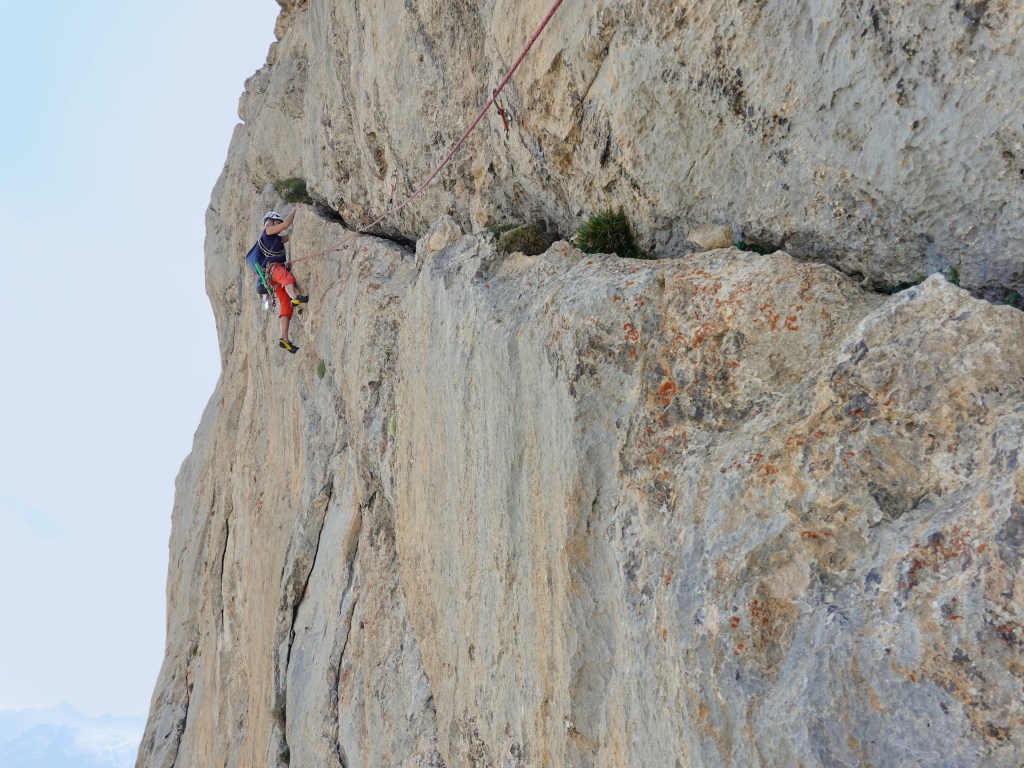 We did a climb that finishes, after four or five pitches so about two hundred meters up, with a long traverse from right to left. The first pitch of the traverse is rated 6a+ (so it’s supposed to be a bit physical but not so very hard). This was my pitch to lead, and it went okay. I arrived at the belay and it was my partner’s turn to follow.